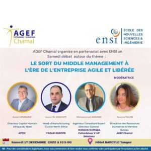 AGEF Chamal organise en partenariat avec l'école des nouvelles sciences et ingénierie (ENSI), un Samedi débat autour du thème : Le sort du Middle Management à l'ère de l'entreprise Agile et Libérée.