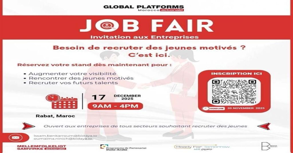 L’incubateur Bidaya lance un Job Fair le 17 décembre 2025 à Rabat dans le cadre de son projet « Global Platform ». L’événement offre aux entreprises l’opportunité de recruter des jeunes formés, de présenter leurs services et de renforcer leur visibilité auprès de partenaires officiels.